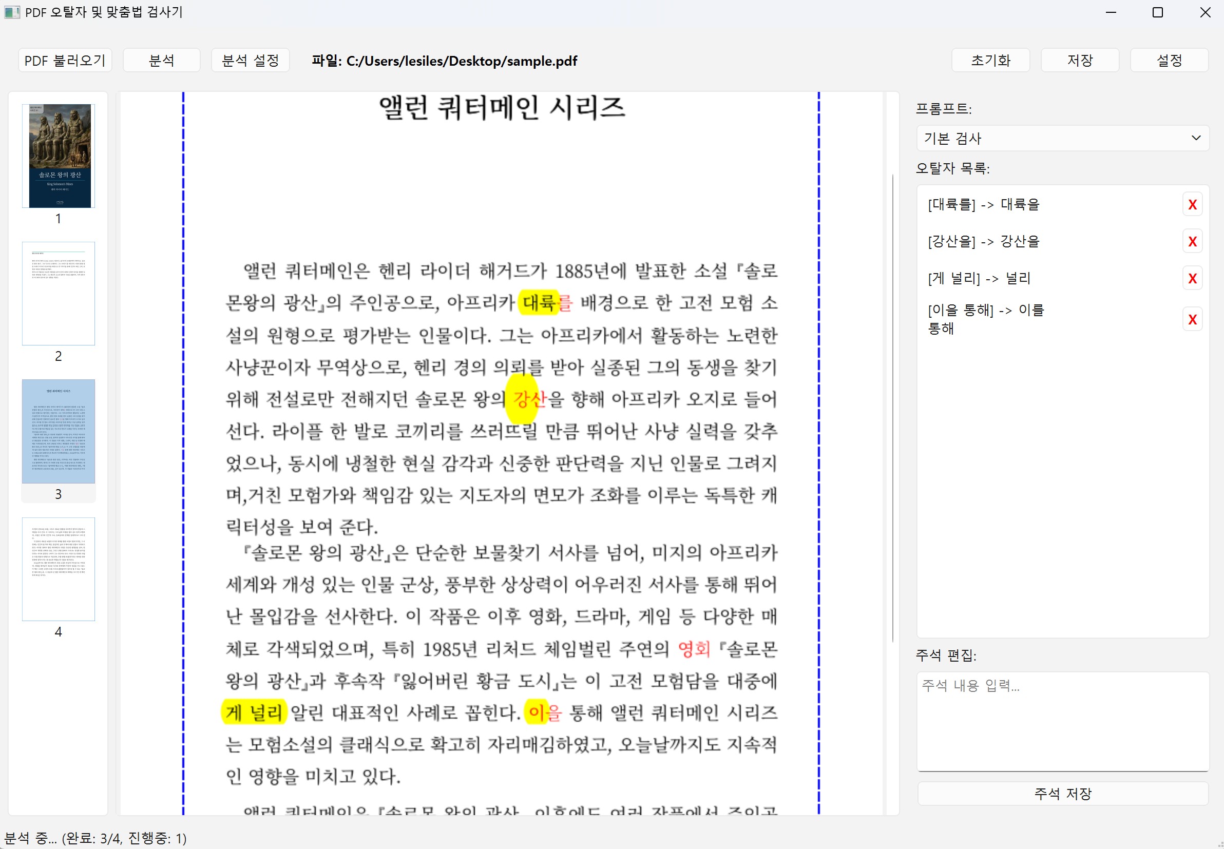 테스트를 위해 3페이지의 PDF에서 1페이지만 골라 임의로 4개의 단어를 맞춤법이 틀리게 하거나,