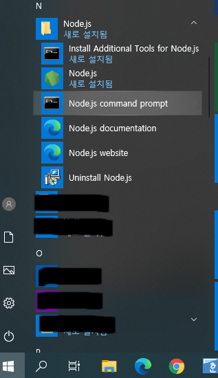 1.3 설치가 끝나면 아래 이미지 참고해서 Node.js Command Prompt를 실행합니다.