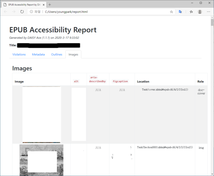 - EPUB을 열고 ACE를 실행하면 접근성 검사가 실행됩니다.