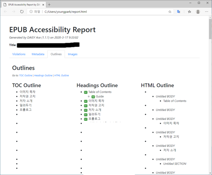 - 그 다음은 아웃라인 정보입니다. TOC 목차와 본문 내 Heading 태그가 잘 정리돼 있는지, 그 외에 어떤 body matter가 포함돼 있는지 등의 정보를 보여줍니다.