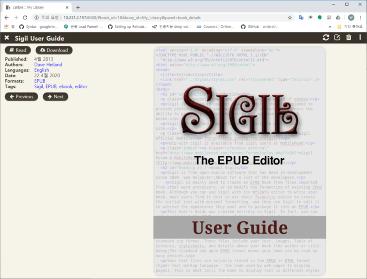 표지를 선택하면 책의 메타데이터를 확인할 수 있고, 다운로드 하거나 읽을 수 있습니다.