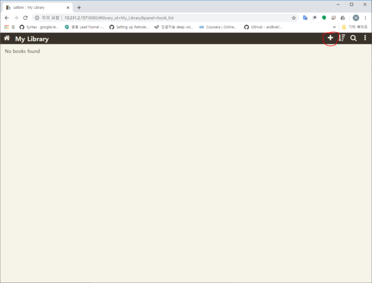 새로 만든 서재여서 책이 하나도 없네요. 오른쪽에 있는 + 버튼으로 책을 추가합니다.