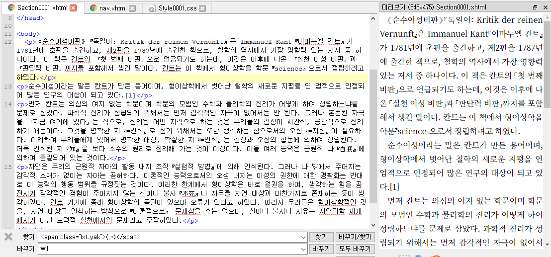 글꼴에 따라 꺽쇠, 괄호 같은 약물이 눈에 거슬릴 때가 있습니다. 제가 즐겨 사용하는 구글 Noto Serif 글꼴은 약물의 간격이 넓어 전자책을 만들고 나면 이렇게 보여요. 글자와 약물 사이에 공백이 없는데 공백이 들어간 것 처럼 보이지요.