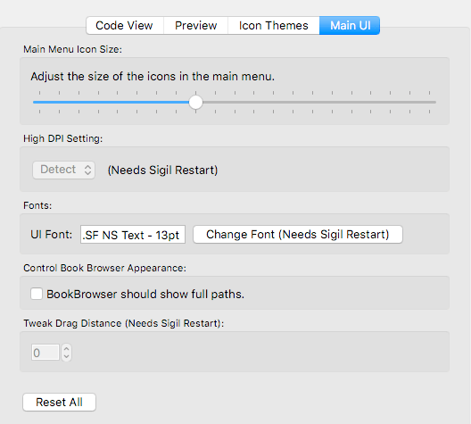 Sigil은 화면에서 보이는 요소의 모양을 사용자 정의할 수 있는 다양한 옵션을 제공합니다. [모양]은 대화 창 상단에 있는 네 개의 탭-코드 보기, 미리보기, 아이콘 테마, 메인 UI 4개의 탭으로 구분되어 있습니다.