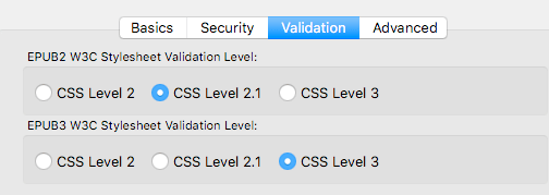 · EPUB2의 W3C 스타일시트 검사 레벨: EPUB2의 스타일시트를 W3C 스타일시트 검증할 때 사용할 CSS 레벨을 설정합니다.