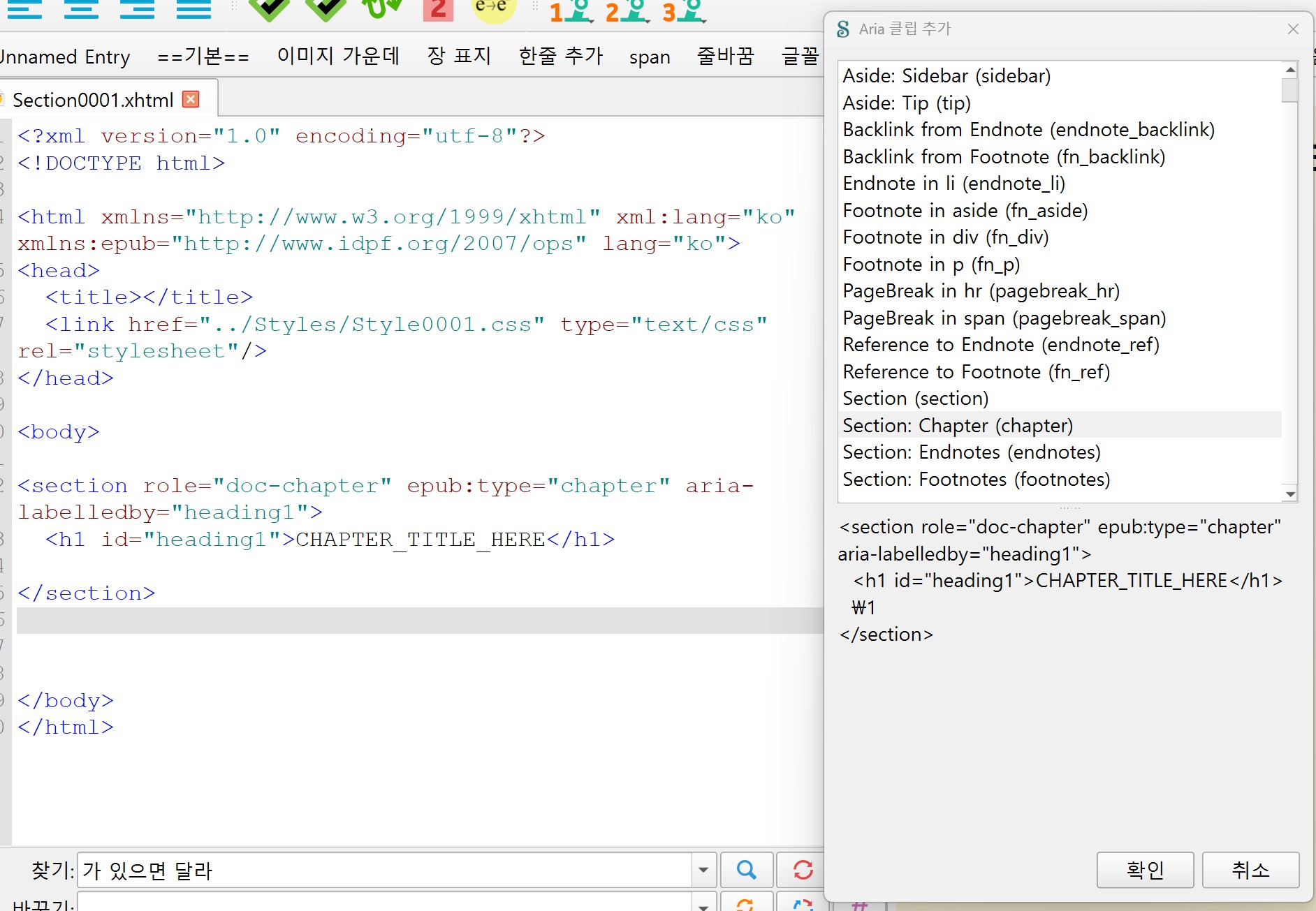 장(doc-chapter)으로 삽입한 구역(section)을 머리말(doc-foreword)로 수정하고 싶다면, 그냥 role을 찾아 클릭하면 됩니다.