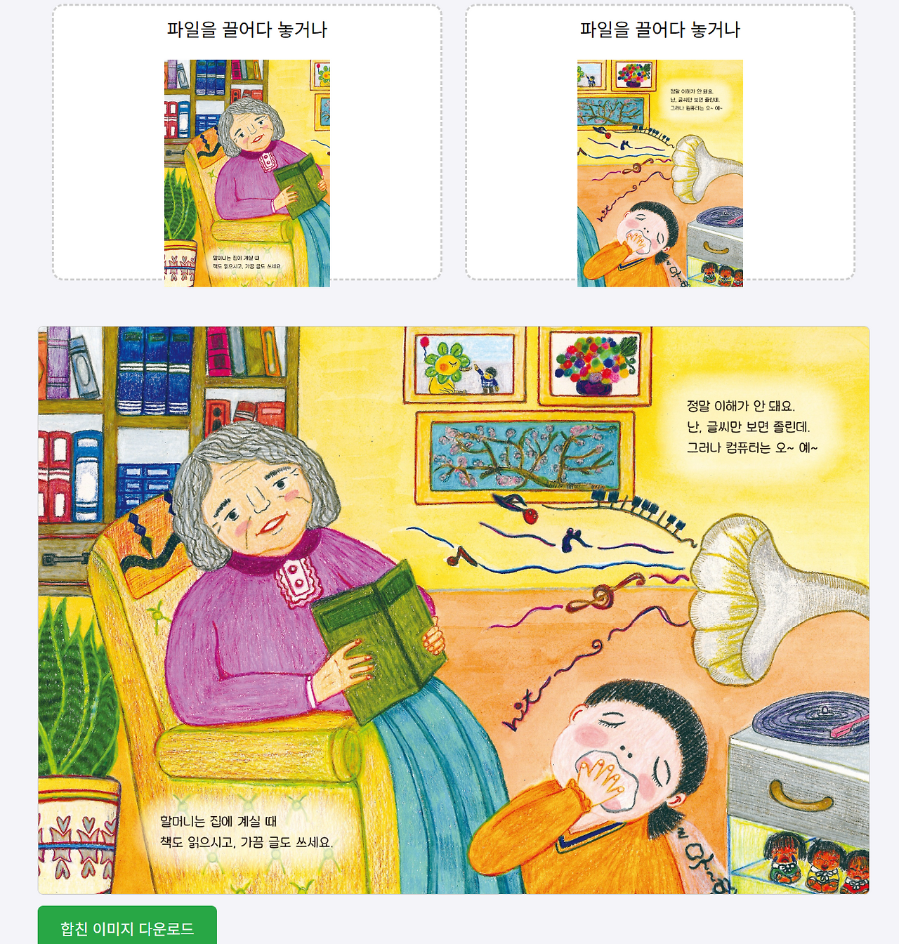 이렇게 합친 이미지가 나오고, 다운로드 버튼을 누르면 jpg 형식으로 저장을 할 수 있습니다.
