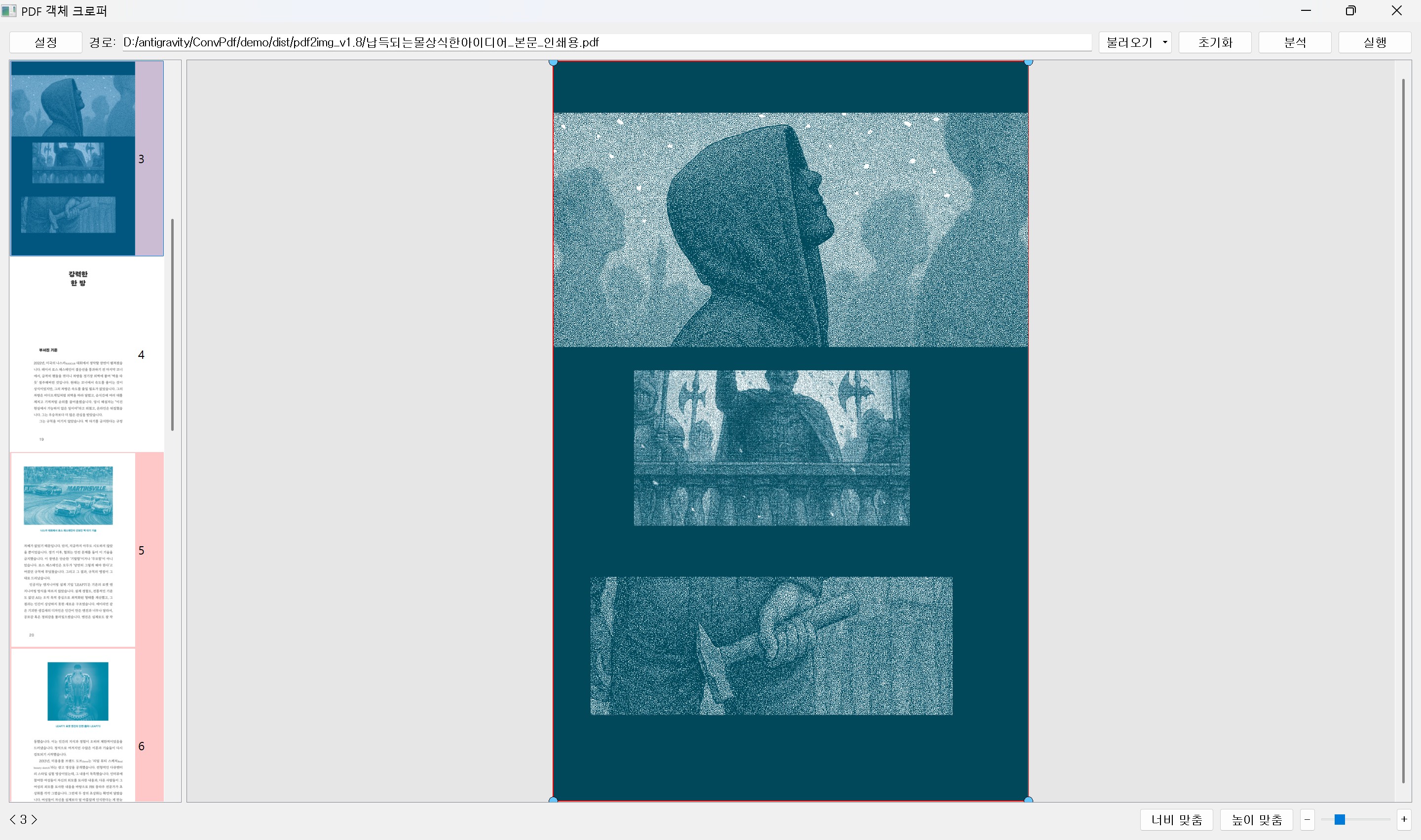 5. 이미지가 있는 페이지는 썸네일에 표시가 되고, 이미지 좌표를 알아서 잡습니다. 이 작업이 이미지를 크롭하는 시간을 절약해줍니다. 도표나 표, 복잡하게 겹쳐 있는 이미지는 좌표가 제대로 집하지 않습니다. del키로 좌표를 삭제 할 수 있고, 레이어 순서를 변경할 수 있습니다. 모서리의 둥근 부분을 클릭해 조절하면 좌표를 수정 할 수 있습니다.