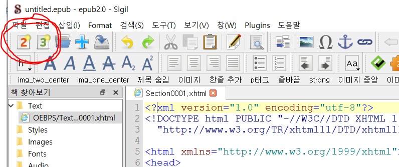 그래도 많이 사용하는 메뉴는 대부분 한글로 볼 수 있으니 처음 Sigil을 접하는 분들께는 도움이 될거예요.
