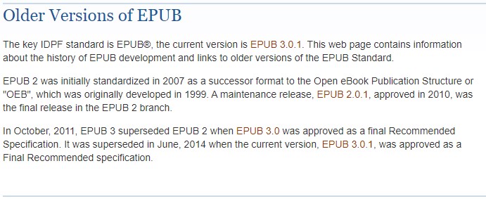 그리고 EPUB2는 2011년 10월에 EPUB3.0으로 대체되었고, 2014년 6월 이후 EPUB2는 더 이상 사용하지 않는 것으로 간주하고 유지관리를 하지 않는다*고 공식적으로 발표를 했습니다.