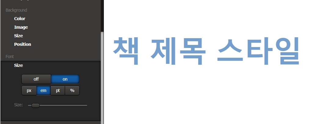 Font 메뉴에서 Size를 On한 다음 EPUB에서 많이 사용하는 em을 선택합니다.