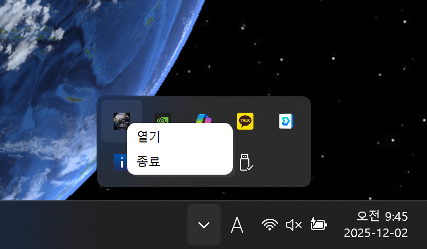 중요!!! 실행을 하면 아이콘 트레이에 들어갑니다.