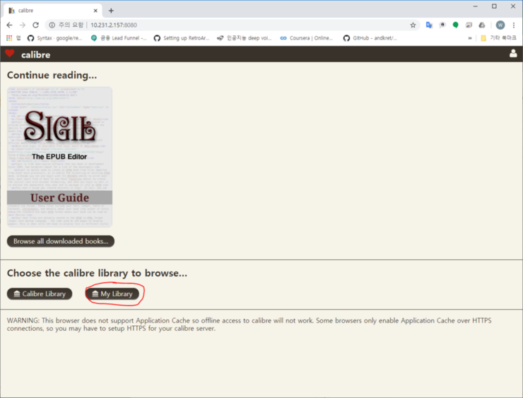 브라우저에서 서버 주소로 서재에 들어갑니다.