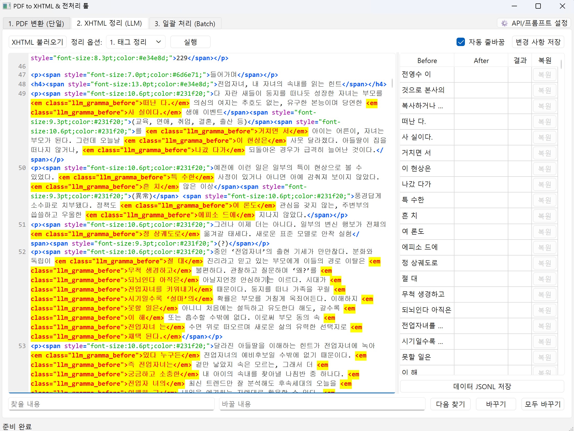 일괄 처리는 PDF를 HTML로 추출, 문단 정리, LLM 정리를 알아서 진행합니다.