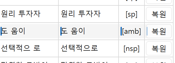 [sp]는 띄어쓰기(spaced)되어야 할 단어, [nsp]는 붙여야 하는(nospaced)단어, [amb]는 확인이 필요한(ambiguous) 단어를 의미합니다.