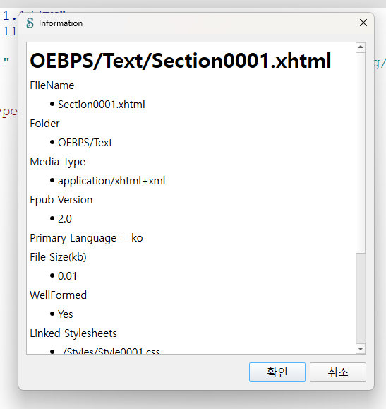 * [보고서]를 실행하지 않고, 책 찾아보기 창에서 선택한 xhtml 파일의 정보를 확인할 수 있습니다. 단어 수, 이미지, 비디오, 오디오 파일 사용 여부, 스타일시트/자바스크립트 연결 정보 등 다양한 정보를 바로 확인할 수 있습니다.