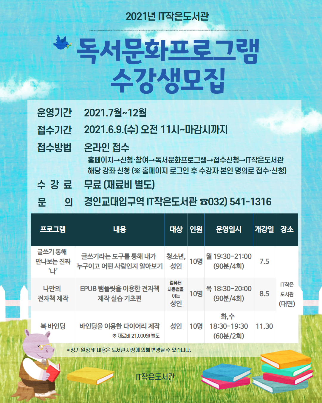 프로그램명 나만의 전자책 만들기 도서관명 IT작은도서관 접수기간(시간) 2021-06-09 11:00 ~ 2021-08-02 23:59 강좌상태 신청진행 행사대기 대상 성인 장소 경인교대입구역 IT작은도서관 수강기간 2021-08-05 ~ 2021-08-26 수강시간 18:30 ~ 20:00 ( 1시간 30분 ) 수강요일 목 정원 (접수정원 / 신청인원) 10 / 1 접수대기 (대기자 정원 / 대기자수) 5 / 0 강사명 박웅영 재료비 0원 첨부파일 강의계획서_나만의_전자책_제작.jpg (119 Kb) 교재비 0 원 ○ 세부 내용...