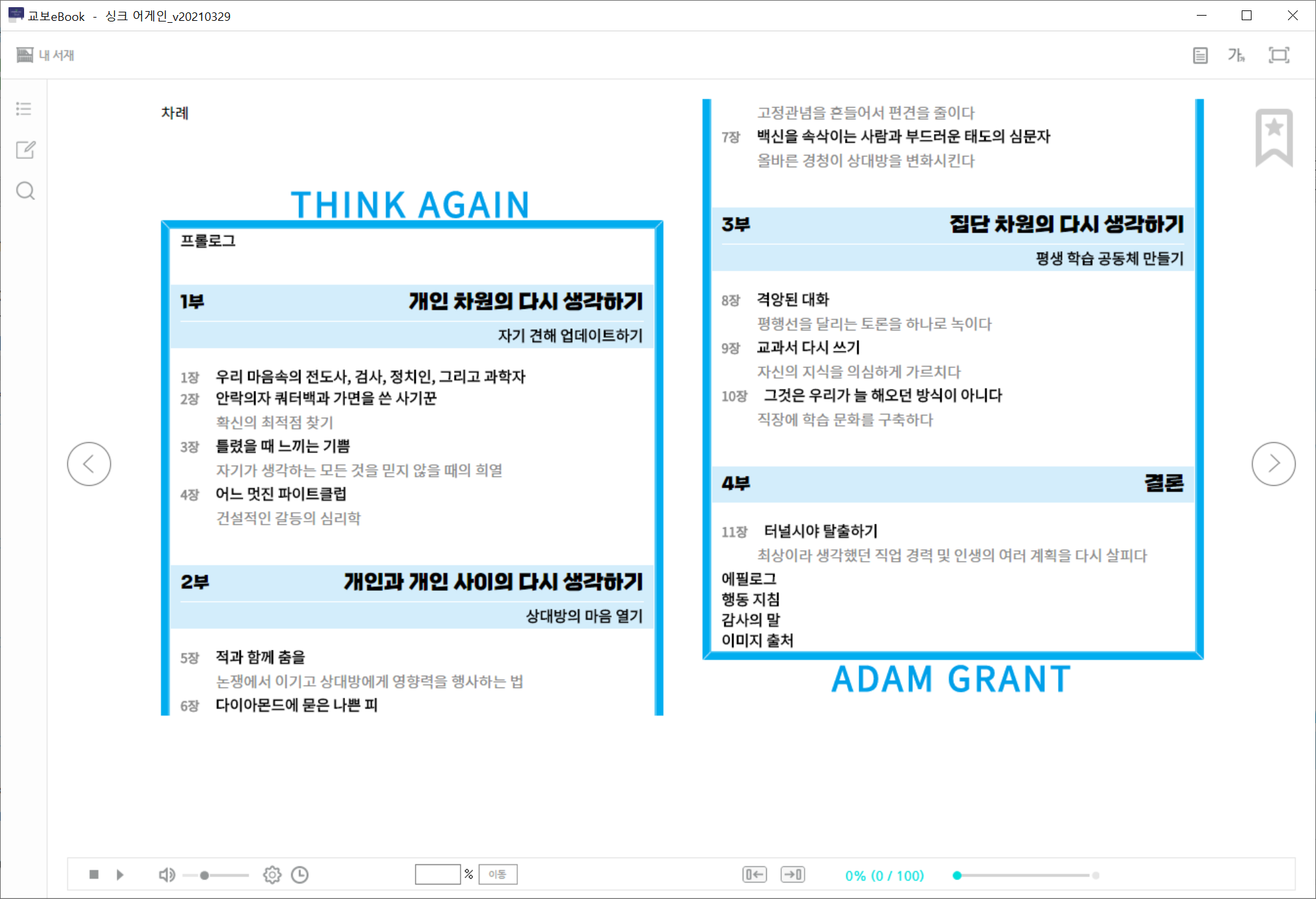종이책은 좌/우수가 구분되서, 좌측에 THINK AGAIN이, 오른쪽에 ADAM GRANT가 들어갑니다.