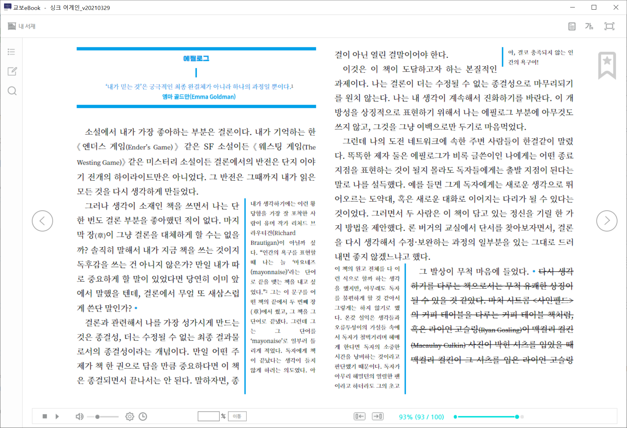 종이책의 편집 스타일을 최대한 유지하며, 팝업 주석 처리, 이미지 확대 축소 등 전자책의 장점을 반영하여 전자책을 제작합니다. 탬플릿을 사용하지 않고, 책 한권 한권 고유 스타일을 살리기 때문에 전자책에서도 종이책 디자인을 느낄 수 있습니다.